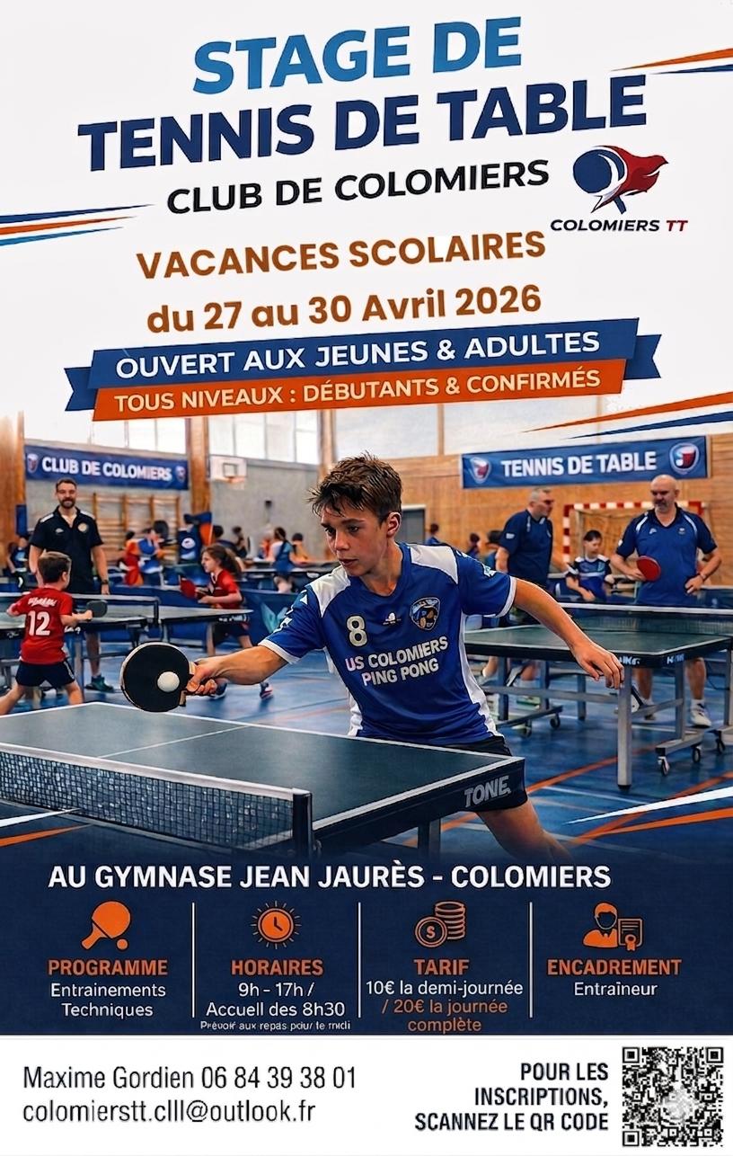 Le club Colomiers TT organise un stage de tennis de table pendant la deuxième semaine des vacances scolaires, du 27 au 30 avril 2026, au gymnase Jean Jaurès à Colomiers.